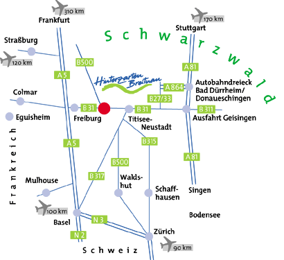A 5 Karlsruhe-Basel: Sie verlassen die A5 bei der Ausfahrt Freiburg Mitte und fahren weiter auf der B31 in Richtung Donaueschingen bis Hinterzarten.